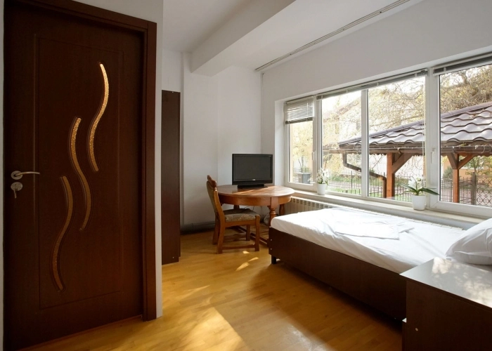 • Одноместная комната с кроватью, шкафом, тумбочкой, иногда ТВ